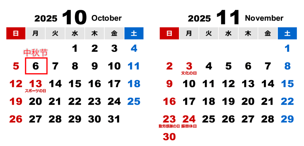 今年的中秋节是2025年10月6日(星期一), 在日本是平日,但好在前面有周末,想约亲朋好友一起过中秋的朋友们可以把聚会时间安排在10月4日和5日。
