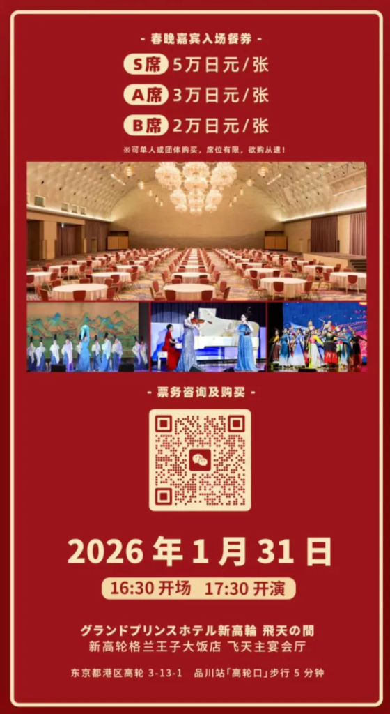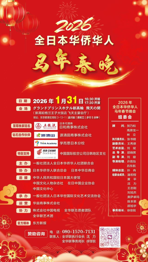 TOC [ open close ] 01/31(土) 2026 全日本华人华侨马年春晚 01/31(土) 2026 全日本华人华侨马年春晚 每年的春晚已成了在日本华人的固定节目。请参考下面的信息。 消息来源: 揭秘全日本华侨华人马年春晚:全华联新闻发布会在东京热烈举办 Post Views: 67