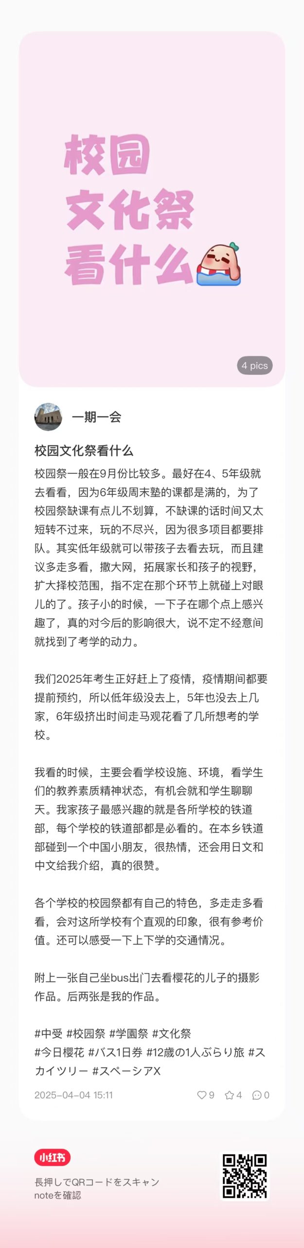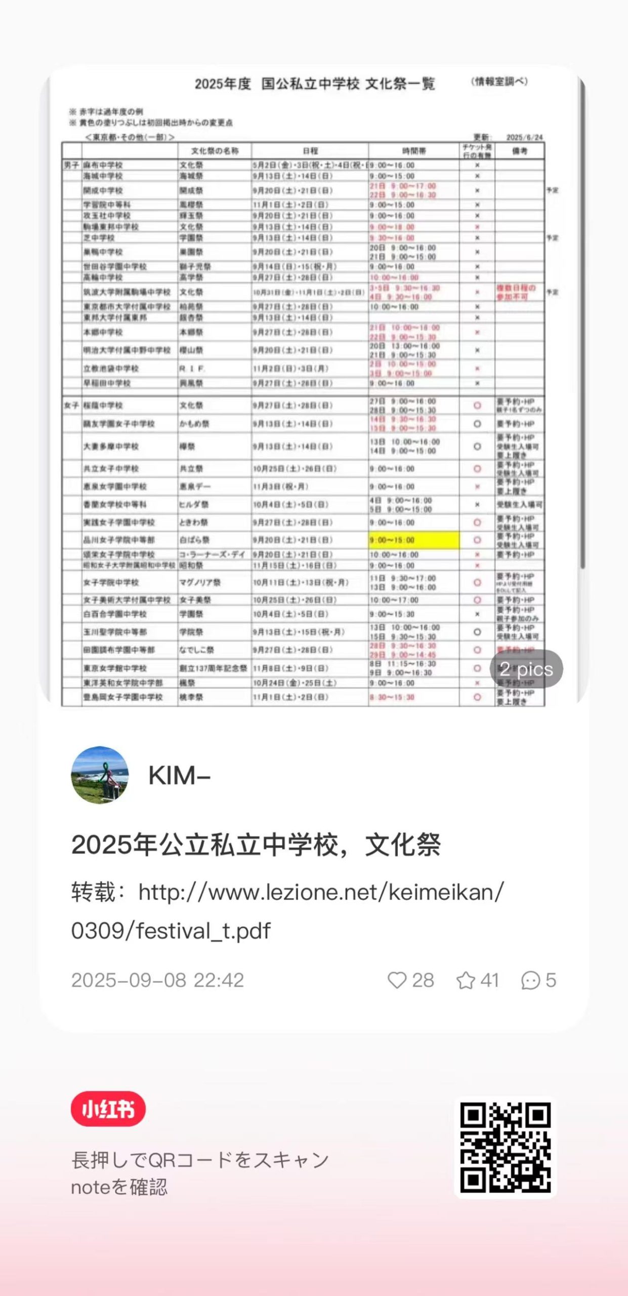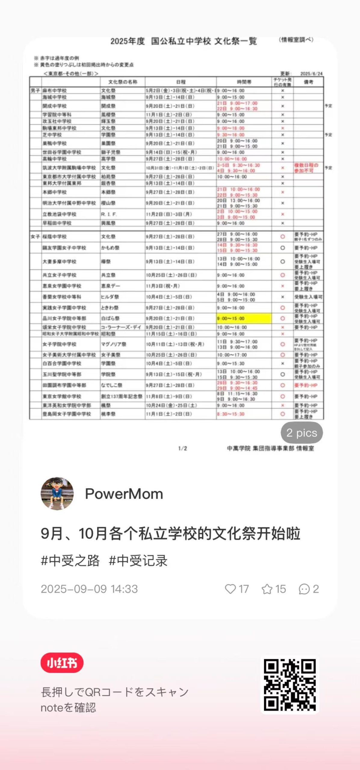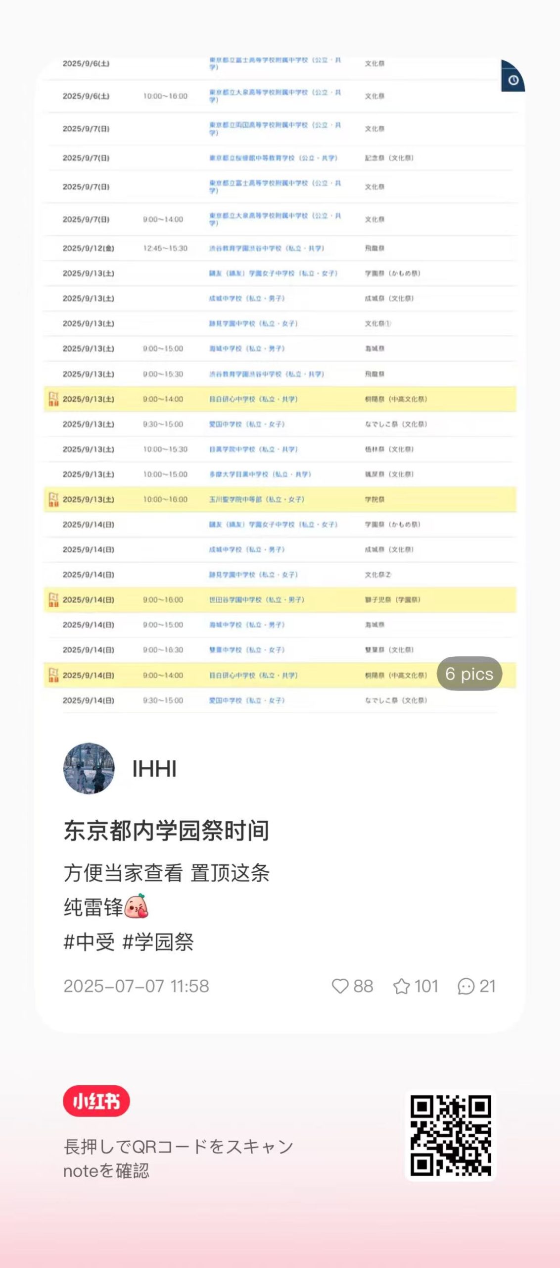 为了方便想了解其它学院的校园祭时间表的家长们,我找了几个不错的小红书内容,可以扫一下每个图片下面的二维码直接跳转到小红书上查看具体内容。