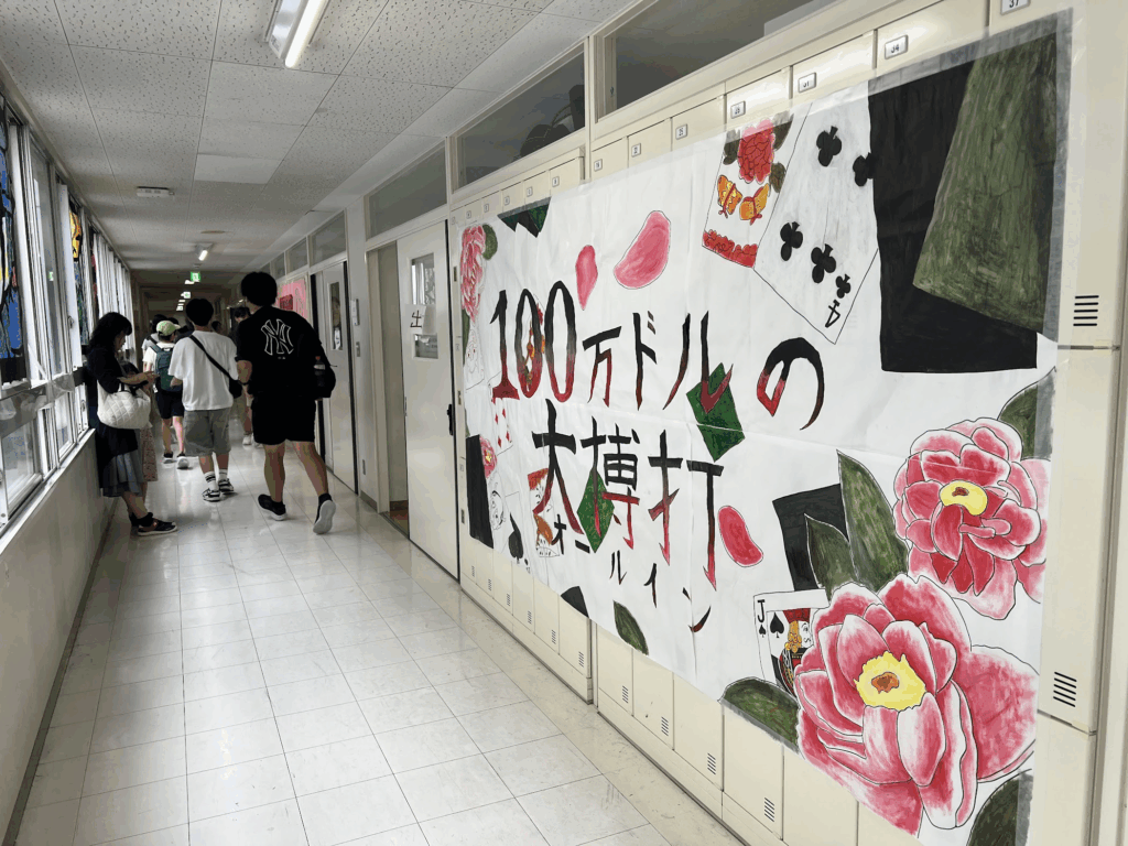 这是教室的走廊,每个教室都安排各种游戏,供来访的学生们游玩。 估计是按班级想出自己的办法,提供各种游戏的。