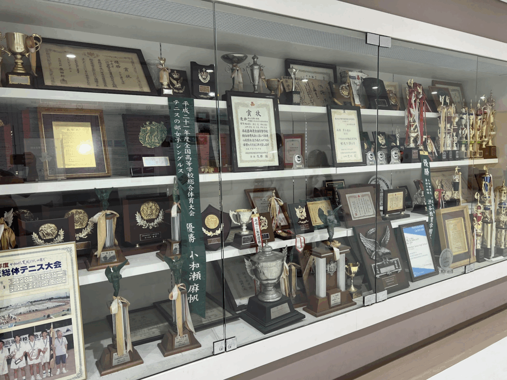 另一栋建筑的走廊边,摆满了学校的各种荣誉。